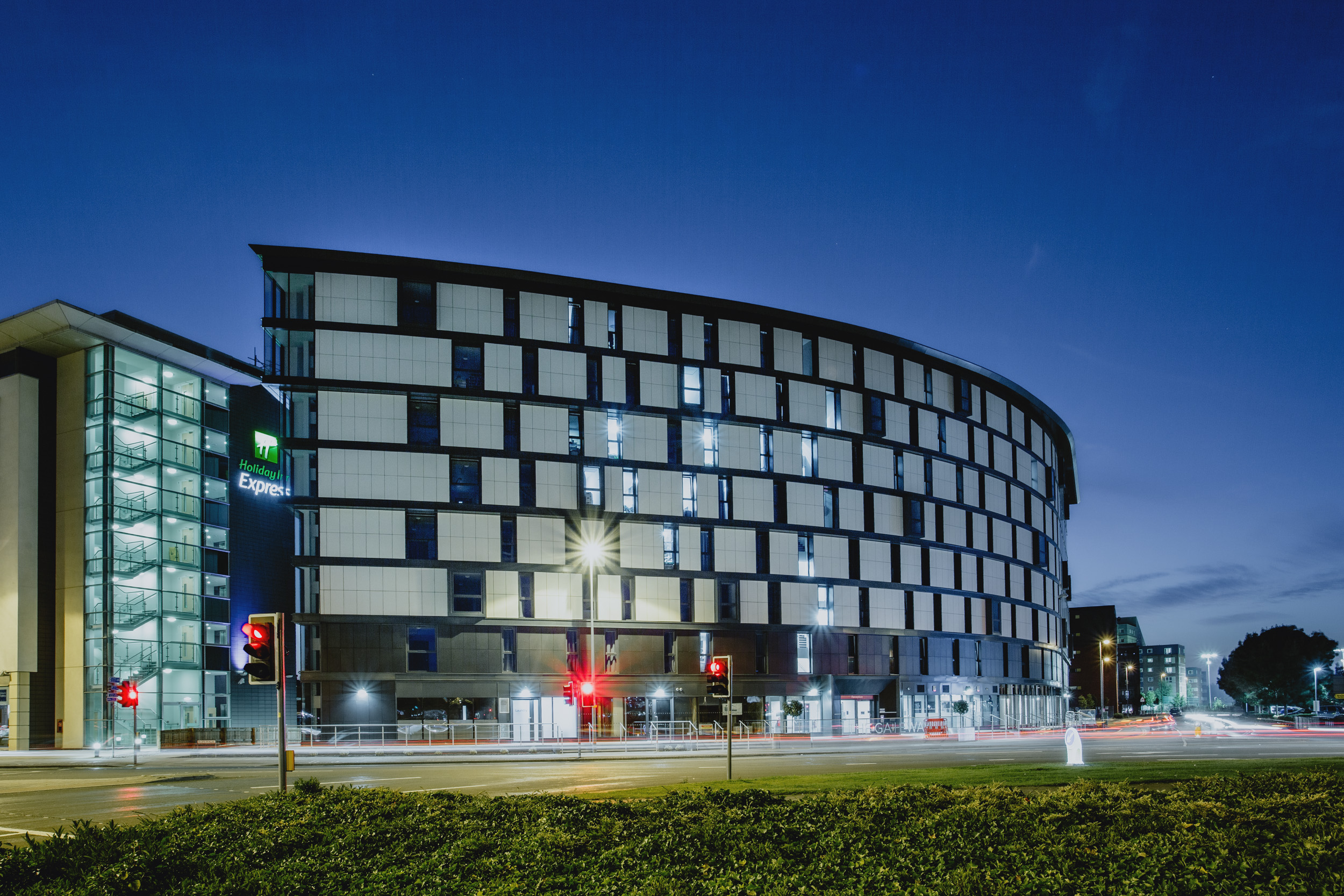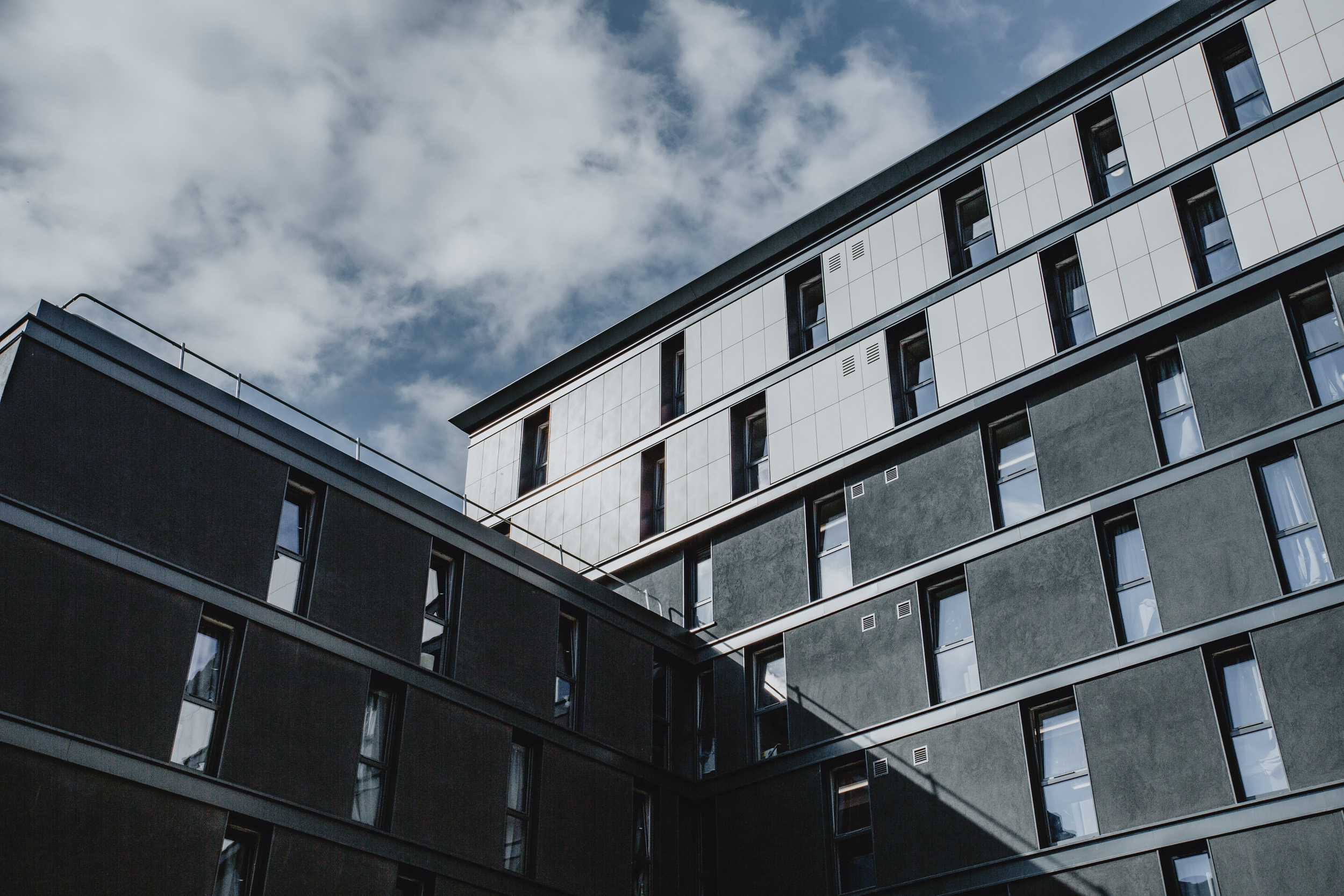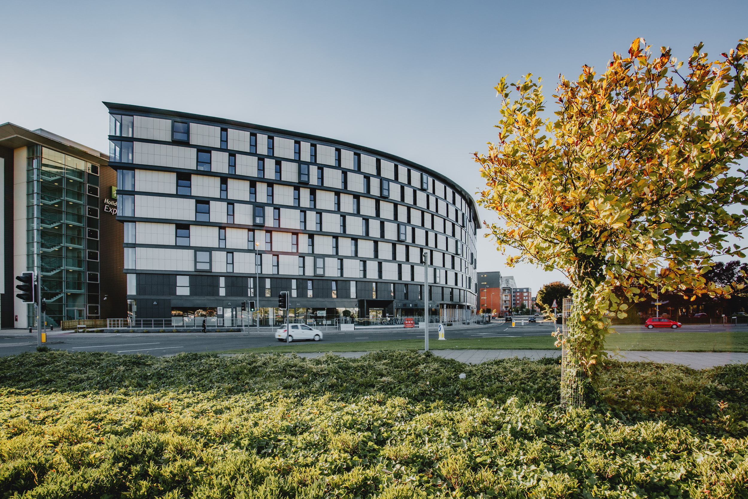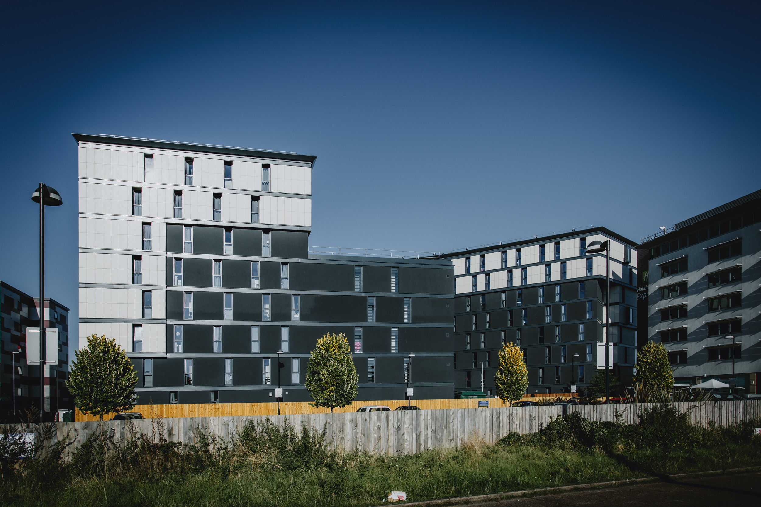 This shoot was for Kier Construction at the Gateway Student Accommodation project in Lincoln city centre. I arrived during the day to make the most of the bright, sunny conditions, capturing the building in clear, crisp light and showing off the materials and overall form. I then stayed through into the evening to photograph it again at dusk, when the lighting softened and the building took on a completely different feel, with the interior lights bringing it to life.